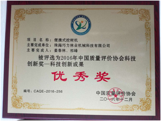 » “便携式挖树机”荣获2016中国质量评价协会科技创新成果“优秀奖”