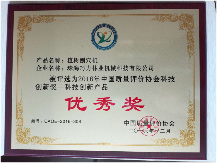 “移动式植树刨穴机”荣获2016中国质量评价协会科技创新成果“优秀奖”