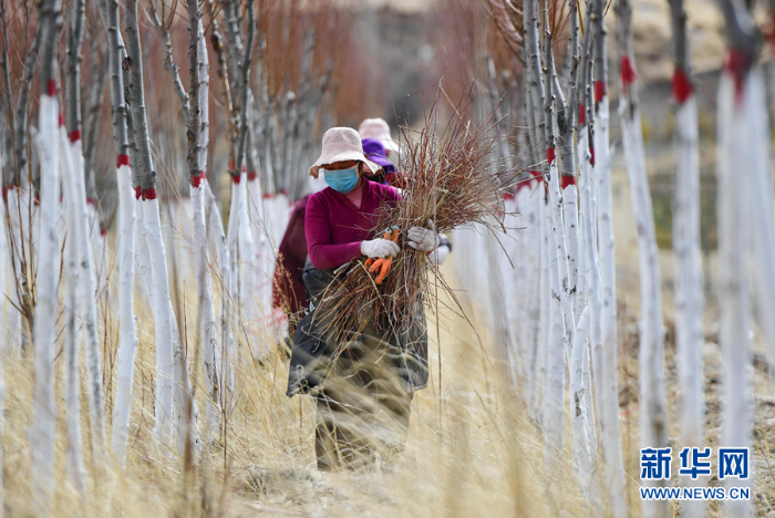 在青海省玉树藏族自治州高原千亩林木良种繁育实验基地,当地群众在清理修剪过的树枝(3月29日摄) 新华社记者 张龙摄