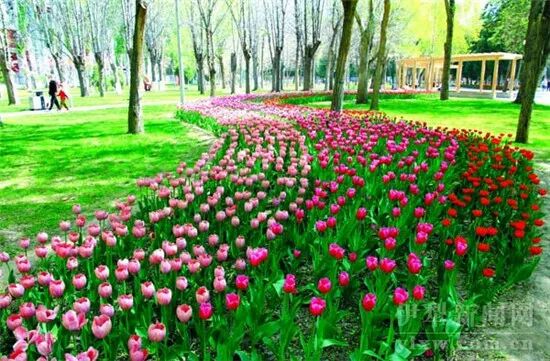 公园里交织在一起的各色郁金香更是争奇斗艳