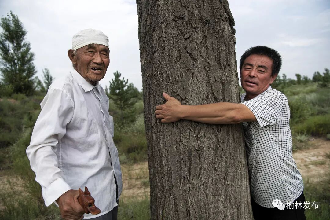 陕西榆林市靖边县东坑镇毛团村年逾九旬的郭成旺(左)的孙儿郭建军抱着老人1984年栽下的一棵树,当年的树苗现已长成参天大树