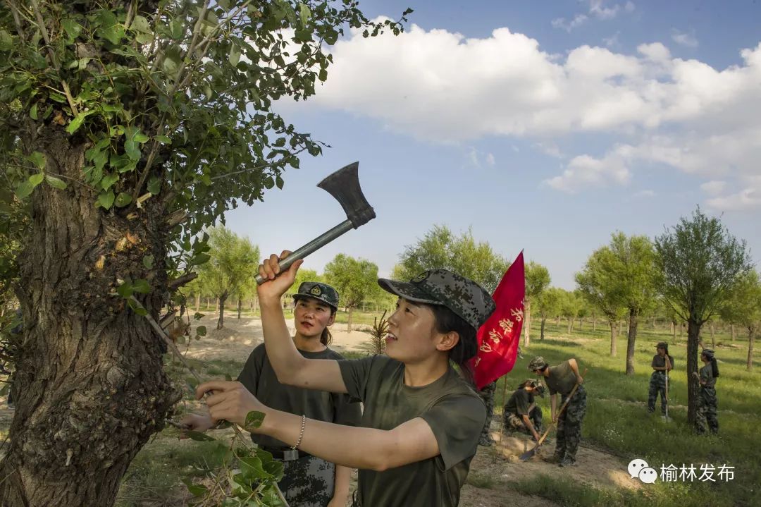 榆林市榆阳区补浪河乡治沙女民兵连的队员们在修剪树枝 刘继远 摄