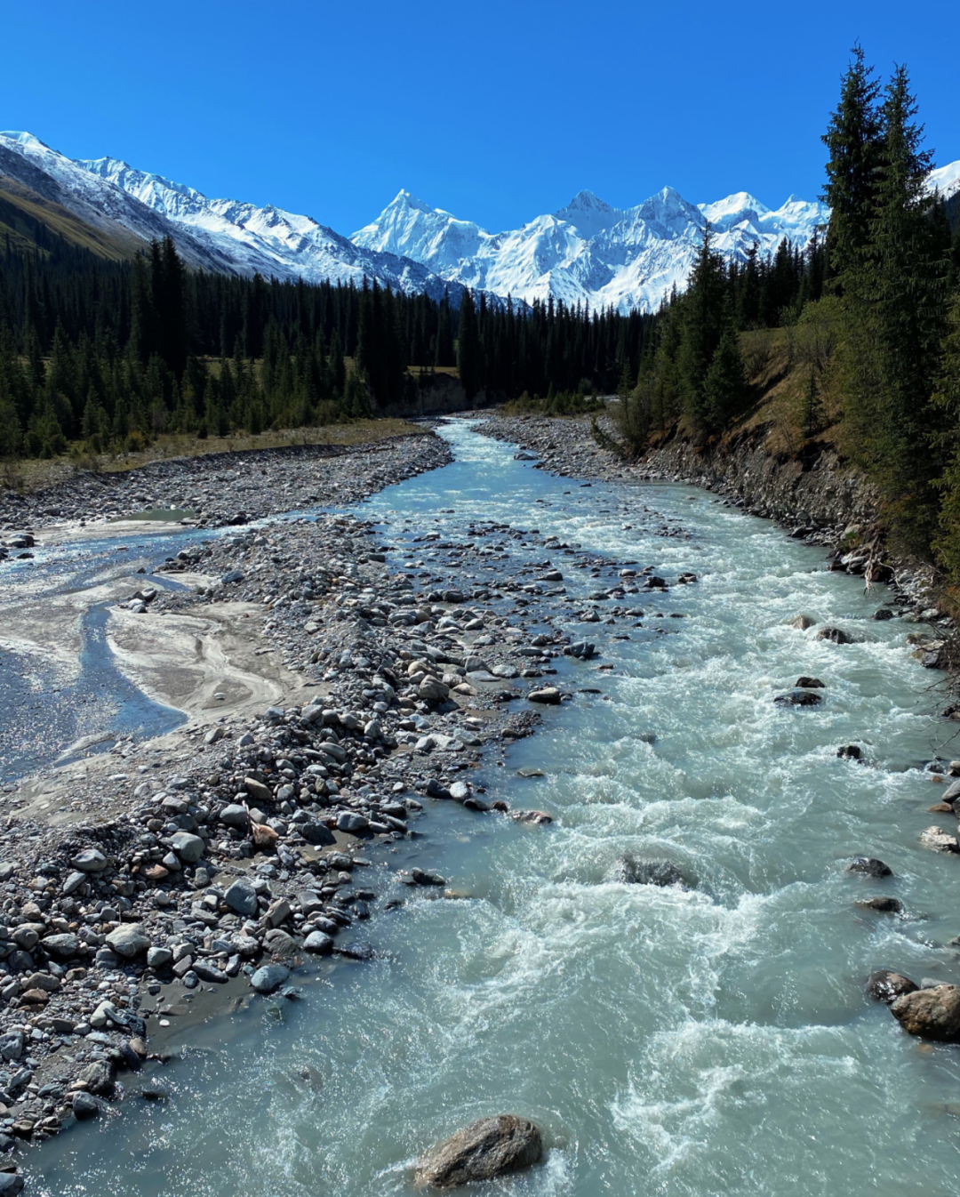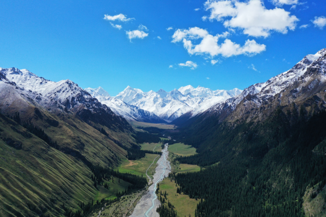 经过悠长的峡谷,眼前豁然开朗的是九曲夏塔河,站在这里可一览皑皑雪山,茂密森林,开阔的河谷草滩,九曲河水蜿蜒而下。夏塔的魅力就在这里。