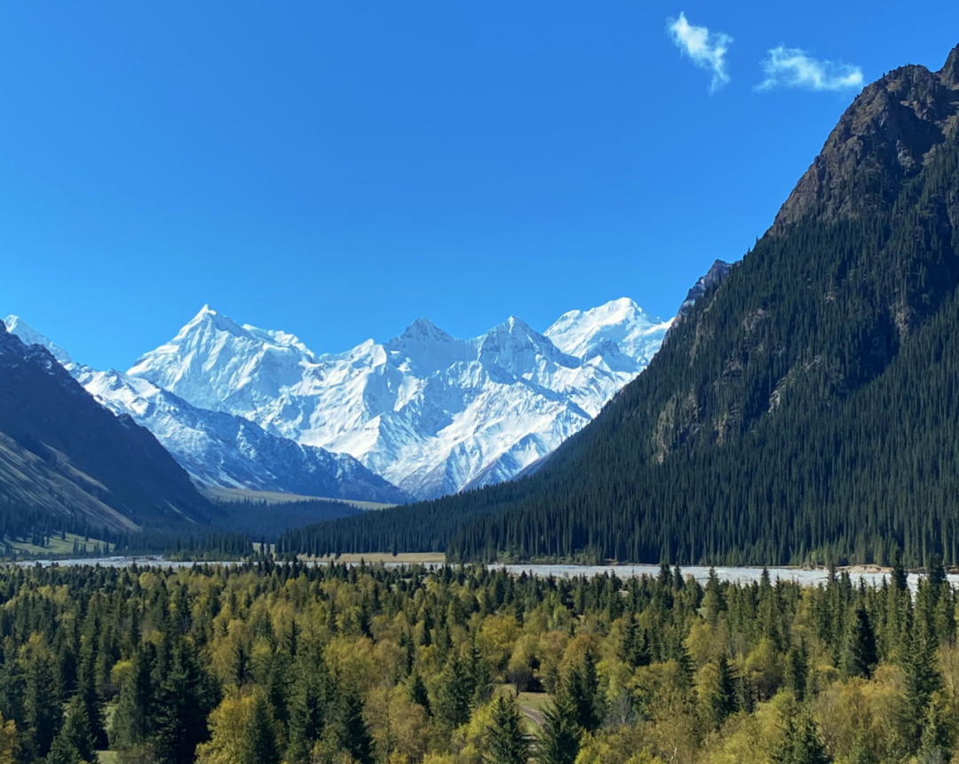 从观景台眺望,河谷中成片的雪岭云杉,一直延伸到雪山脚下,雪莲峰宛若一朵盛开的雪莲花,绽放在翠绿的云杉林之上。在蓝天白云的映衬之下,巍峨雄壮,时有白云缭绕山尖,为雪山蒙上了一层神秘面纱。
