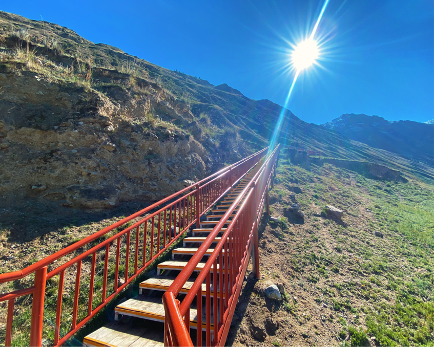 登上温泉南侧的观景台,可一睹雪莲峰的雄姿。雪莲峰海拔6627米,位于天山第一高峰托木尔峰东北66公里处,远眺如盛开雪莲,故此得名。雪莲峰的三条主山脊(西南山脊、东南山脊和北山脊),构成了莲花洁白的花瓣。