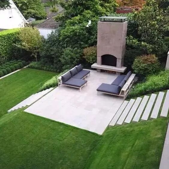 在台地庭院上布置一个绿油油草地上的休闲区,生活舒适度会不会提升一个层次,反正看着感觉让人很舒服就对了。