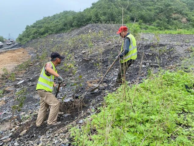 眼下正是雨季,距离已关停的木城涧煤矿不远,一片被煤矸石染得透黑的坡地正在栽树。坡地上挖出了一个个直径七八十厘米,深约半米的种植坑。工人回填从别处运来的好土后,再把一棵棵黄栌、油松、刺槐等树苗小心地栽进坑里。地是黑的,树是绿的,用不了两年时间,树下的植被也会渐次长起来,浓重的工业遗迹将被生机勃勃的绿色覆盖。