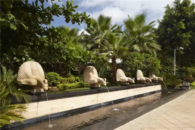 以热带温湿气候自然景观为主题,由主园路串联各个主题景观空间,让人徜徉于人造景观与自然景观之间,使回归自然的度假情趣油然而生。丰富的植被,起伏的山体,茂密的椰林,宽阔的水面、充足的阳光,斑驳的影像在景观设计中得以充分的体现。配合多种形式的水景,不仅象征着生命源泉,也能很好的调节湿度,并在细节处冠以独特巴厘岛风格的小品元素,力求打造巴厘岛南洋风情的度假中