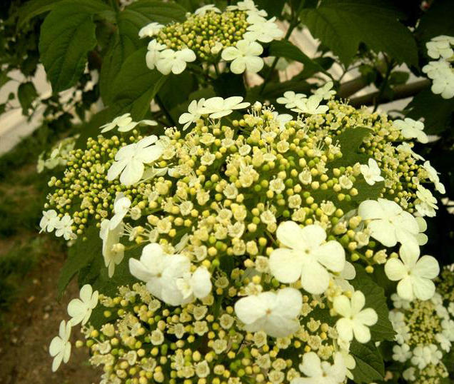 伞形聚伞花序顶生,紧密多花,由6~8小伞房花序组成,直径8~10厘米,能孕花在中央,外围有不孕的辐射花,总柄粗壮,长2~5厘米;花冠杯状,辐状开展,乳白色,5裂,直径5毫米;花药紫色;不孕性花白色,直径1.5~2.5厘米,深5裂。