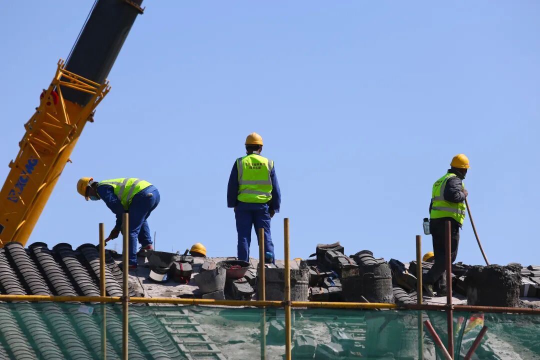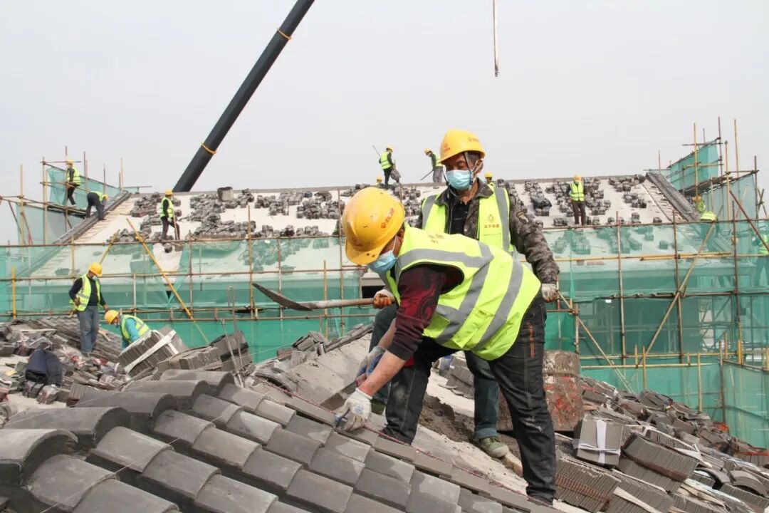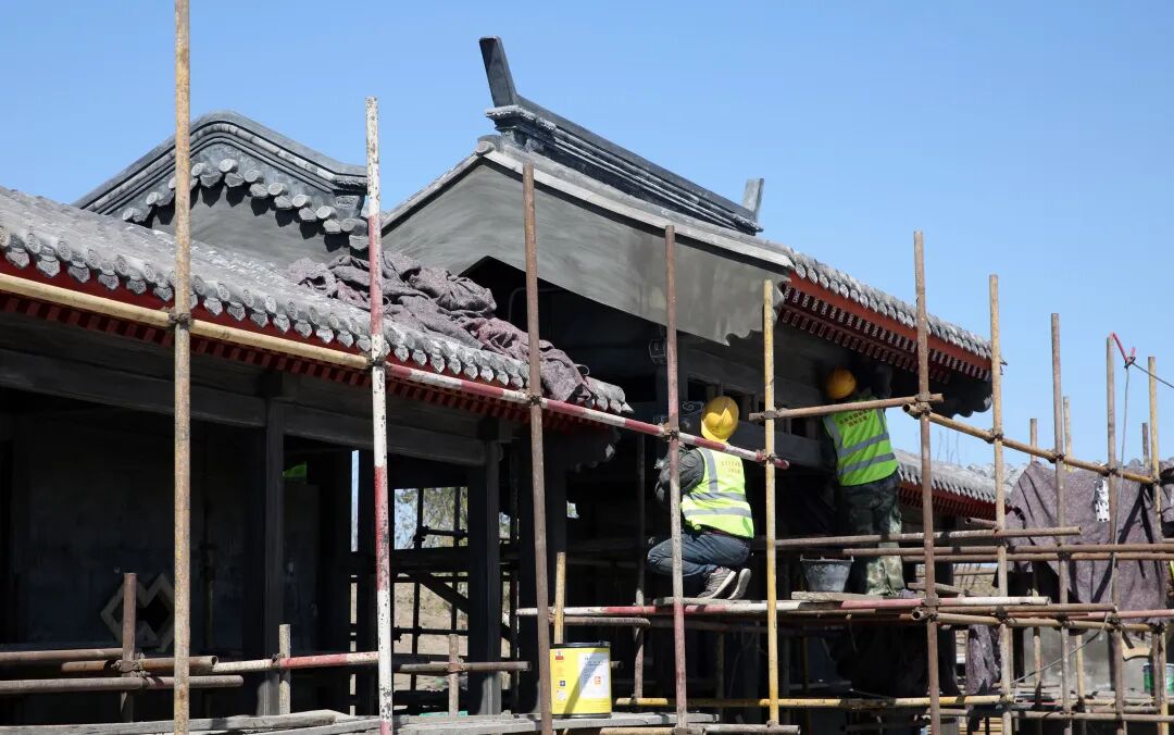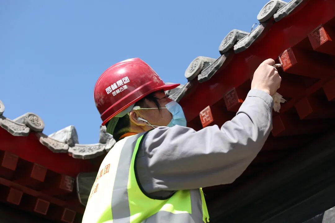 不远处的古建筑上,城建园林古建公司非物质文化遗产传承者李燕肇用灵动的画笔描绘着古今。他说:“庭院建筑为仿明清小式做法古建筑风格,占地面积501.84平方米,浅棕色油漆,彩画装饰,整体朴素大方,由正门的敞轩、西侧的四角亭和东侧茶室组成,几座单体建筑以垂花门,游廊相连接,作为古建匠师专家团队成员之一,我与卢立辉、李海先组成专家团队尽己所能为副中心建设锦上添花。”话音未落,另外一边“添砖加瓦”的瓦匠们发出“叮叮当当”的声音,他们正在对古建筑屋顶进行二次结构施工。这一个个叠落的小小瓦片,不仅可以防止雨水渗入室内,还具有保温、隔热的作用,可谓凝结了中国古建历史的大大智慧。