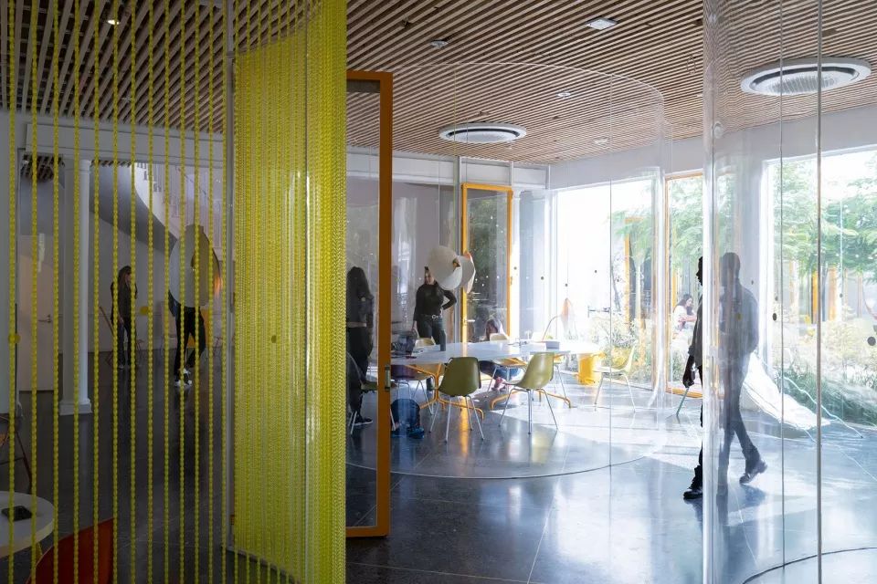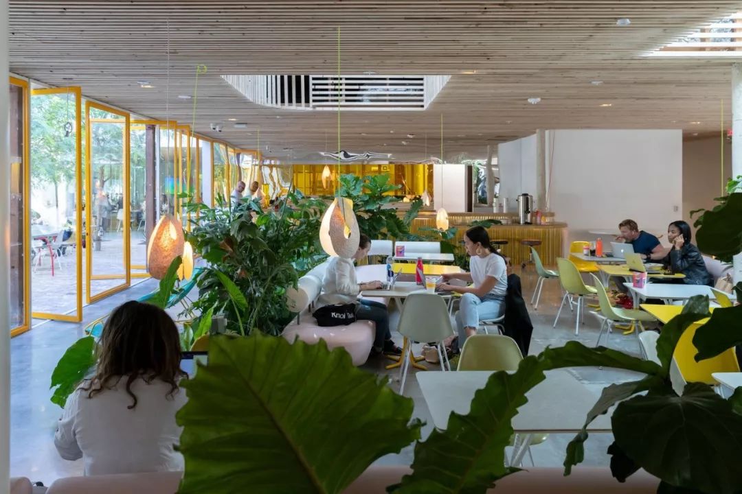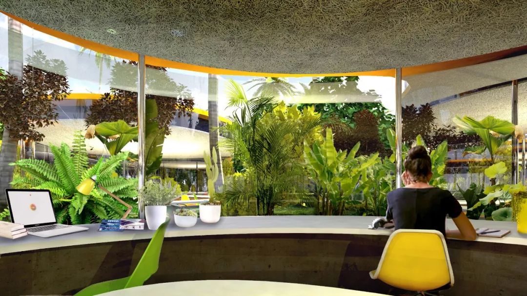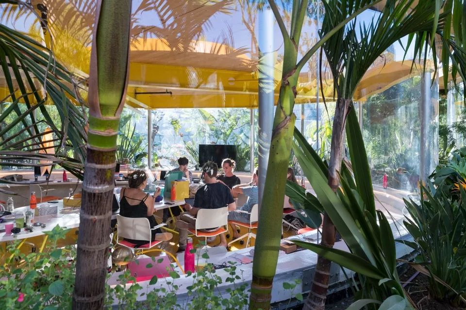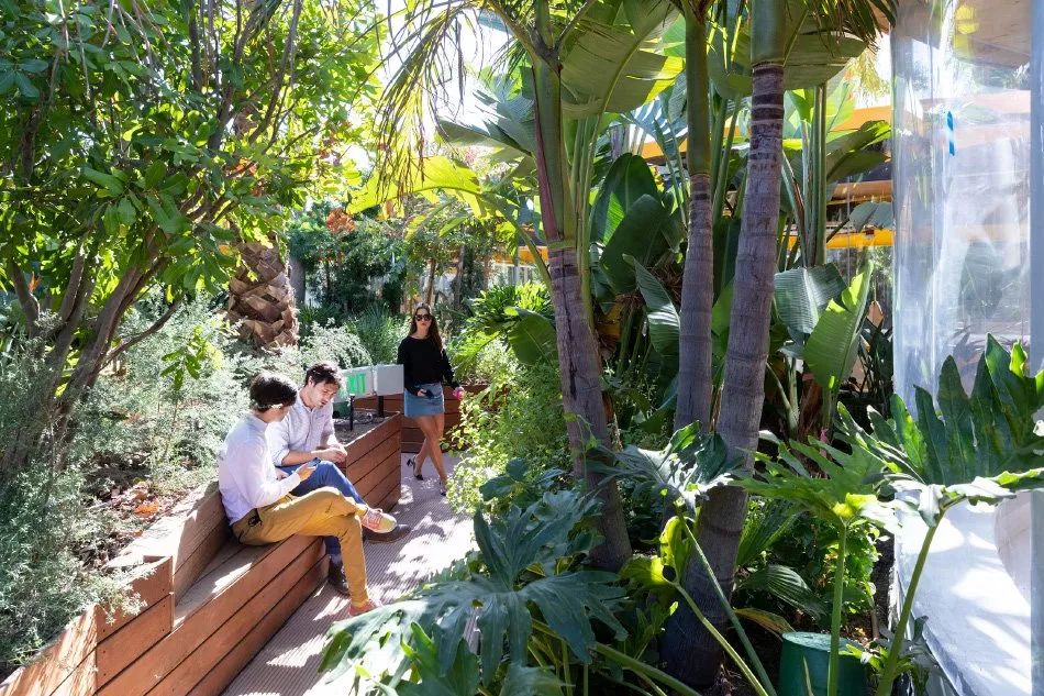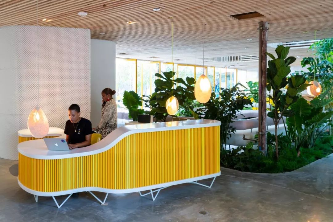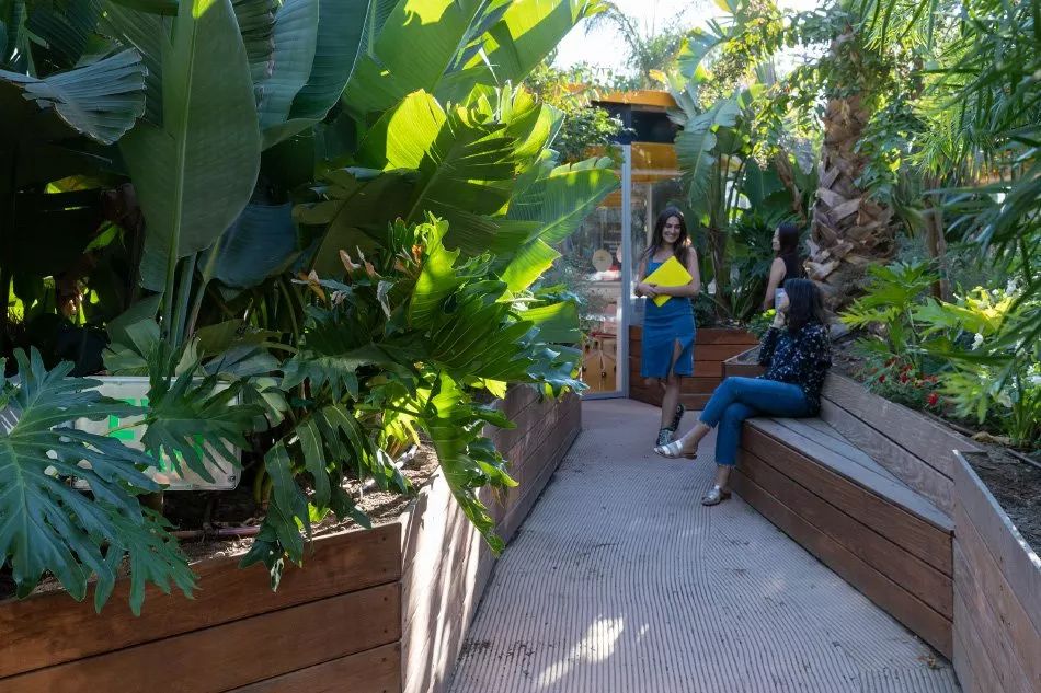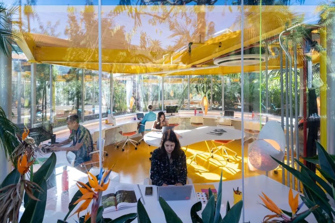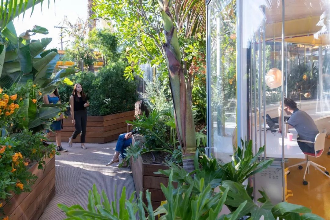 多数办公室为提升办公舒适度,通常会放大量绿植。如果直接把办公室建在绿化之中,会是一种什么样的感受?该项目最大的亮点将位于地下车库上方的建筑拆除改造为一个巨大的花园空间,围绕散布60个四种不同形状尺寸的椭圆形独立办公空间和会议室,可容纳700名工作人员。Second Home好莱坞办公室被视为是一次办公空间设计实验,借此探讨人们与动植物和谐共处的空间模式。椭圆形独立建筑被“嵌入”1.2高的花坛中,相当于与桌面齐平的高度。这样一来,员工在室内可以360度欣赏到花园内的植物,营造出在大自然中办公的氛围。60个独立办公室就像是聚集在花园里的花盆,其中环绕超过1万多种花草树木,并让蝴蝶、蚂蚁、蜜蜂、松鼠与人们共同置身于花园。设计极尽自由开放,全透明空间设计以及鲜亮色彩让空间充满动感与激情。贯穿花园的路径由木材和混凝土构成,两侧种满了全年生花卉,以营造一种充满生机活力的自然之感。