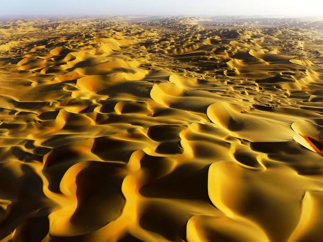 塔克拉玛干沙漠位于塔里木盆地中心,是中国最大的沙漠,也是世界第二大流动沙漠,东西长约1000公里,南北宽约400公里,面积达33万平方公里,相当于德国国土面积。其中大约85%由流动沙丘组成,一些沙丘甚至高达200至300米。