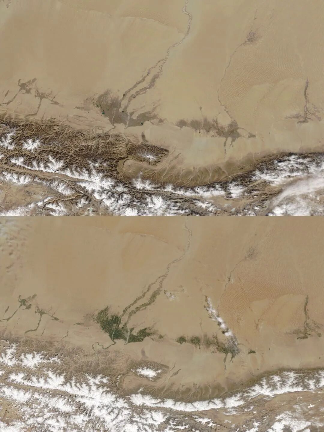 NASA卫星Terra上的中分辨率成像光谱仪采集了2020年2月23日和4月29日和田附近一部分沙漠的图像,发现4月底和田附近的沙漠较2月份局部出现绿色,NASA表示,植被正在大地上萌芽。