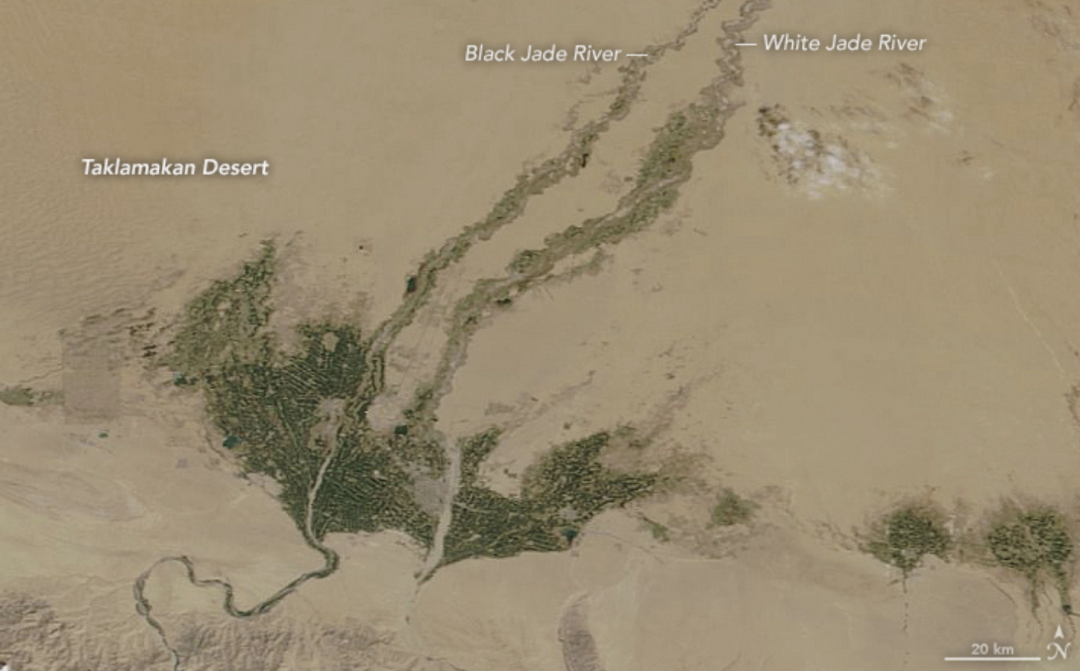 例如,发源于昆仑山的喀拉喀什河(墨玉河)和玉龙喀什河(白玉河),水量补给主要依靠昆仑山(图像底部)的高山融雪,两条河水占和田地区各河总水量的61.2%,为和田地区及植物生长提供宝贵水资源。两河汇合后形成的和田河由南向北穿越塔克拉玛干沙漠注入塔里木河,是塔里木河的重要源头之一。