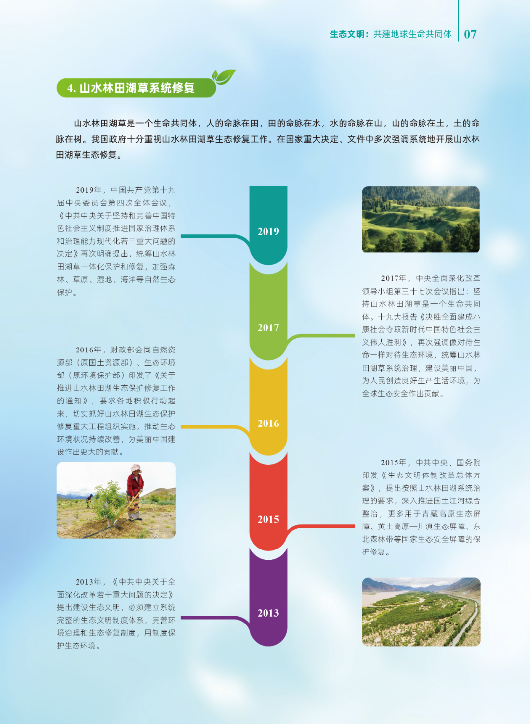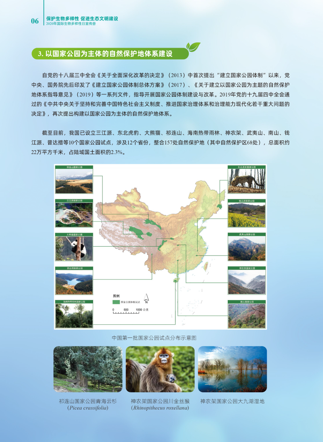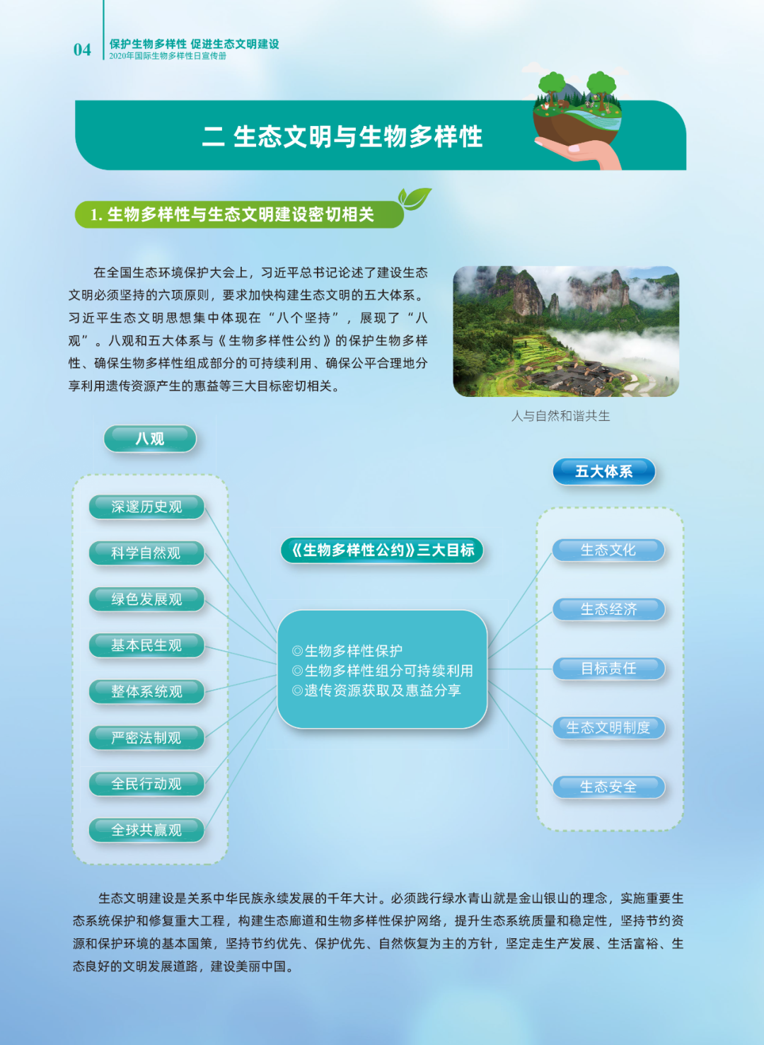 习近平生态文明思想为推进生物多样性保护工作提供了根本遵循,为正确处理好保护和发展的关系,实现人与自然和谐共生的愿景提供了思想指引和行动指南。生物多样性是生态文明建设的重要内容,为促进生态文明建设,我国开展了生态红线划定、以国家公园为主体的自然保护地体系建设以及山水林田湖草生态修复等工作。
