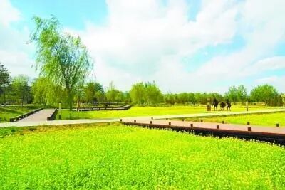 早在2010年,北坞公园率先完工,它恢复了稻田,在公园里有了农田般开阔的空间,而不是种树追求林荫。金山寺、戏台、拆迁村里原有的大柳树也被保留,让拆迁上楼的居民回到这里时时刻刻都能忆起乡愁。公园里的湖也是纯天然的,没有铺设防渗膜,水位线随着自然水位线的涨落而涨落。